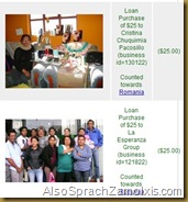 Am imprumutat unui grup pentru prima data. Imprumutatul catre un grup este mult mai putin riscant dat fiind ca intreg grupul este responsabil daca vreunul din membri nu plateste inapoi, dar tocmai de-aia, incerc sa dau imprumuturi celor care sunt de capul lor. Ca si in trecut, am facut imprumutul in numele echipei Romania. In prezent, suntem 32 de suflete, am facut 160 de imprumuturi (deci 5 de caciula) pentru un total de $4,200! Iata si membrii echipei, iar pentru cei care au facut asta public, sub nume se afla profesia, de ce imprumuta, adresa web si data cand au intrat in Kiva.